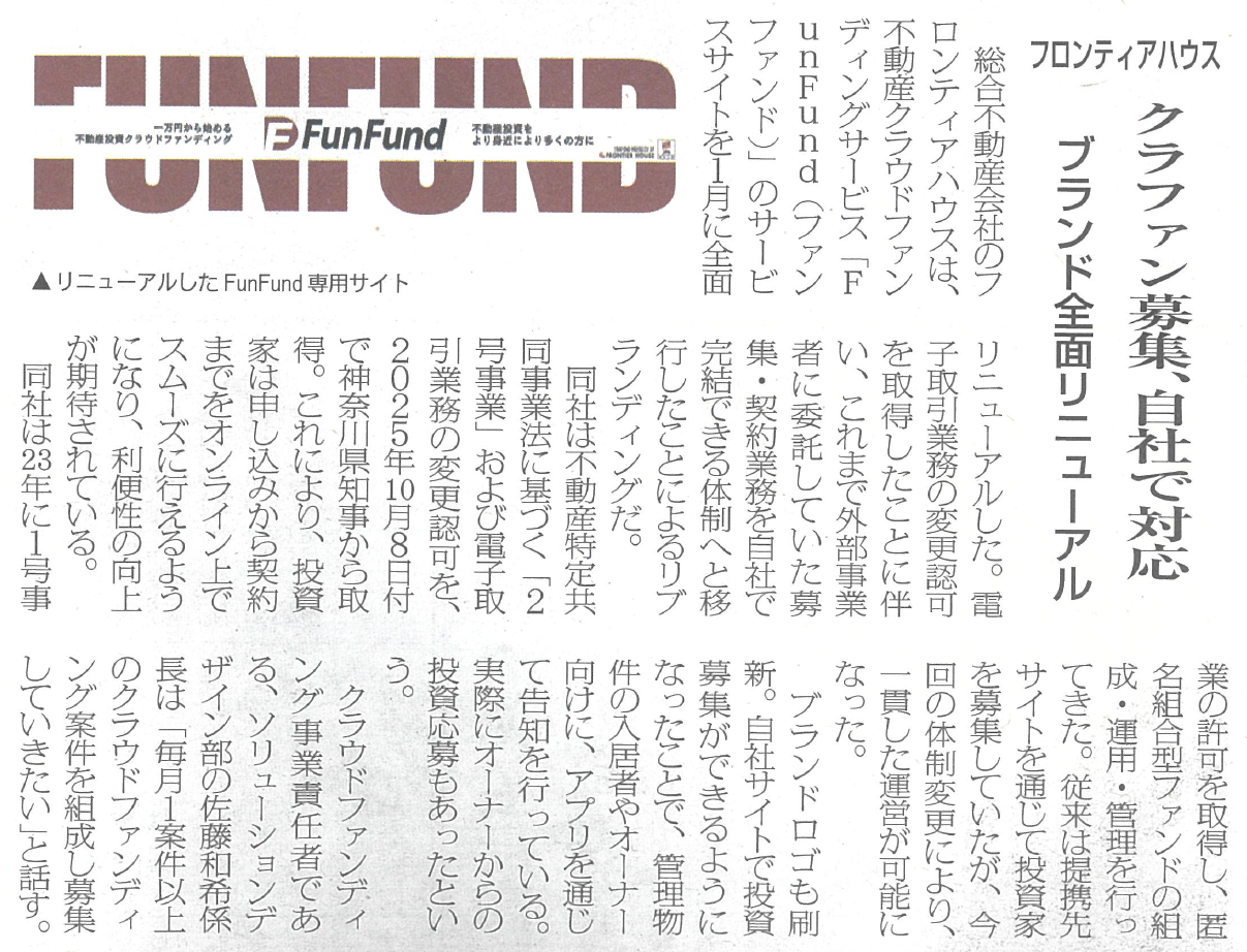 不動産クラウドファンディング「FunFund」に関する記事が「全国賃貸住宅新聞」に掲載されました。
