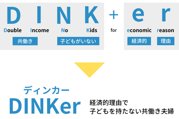 この状況が深刻化する背景として、DINKsが増加していることが挙げられます。女性の社会進出が進み、ポジティブに出産をしない選択をする夫婦が増える一方、経済的不安を理由に出産をしない選択をする夫婦「DINKer」(下図参照)が増えているのも実情です。(※1)