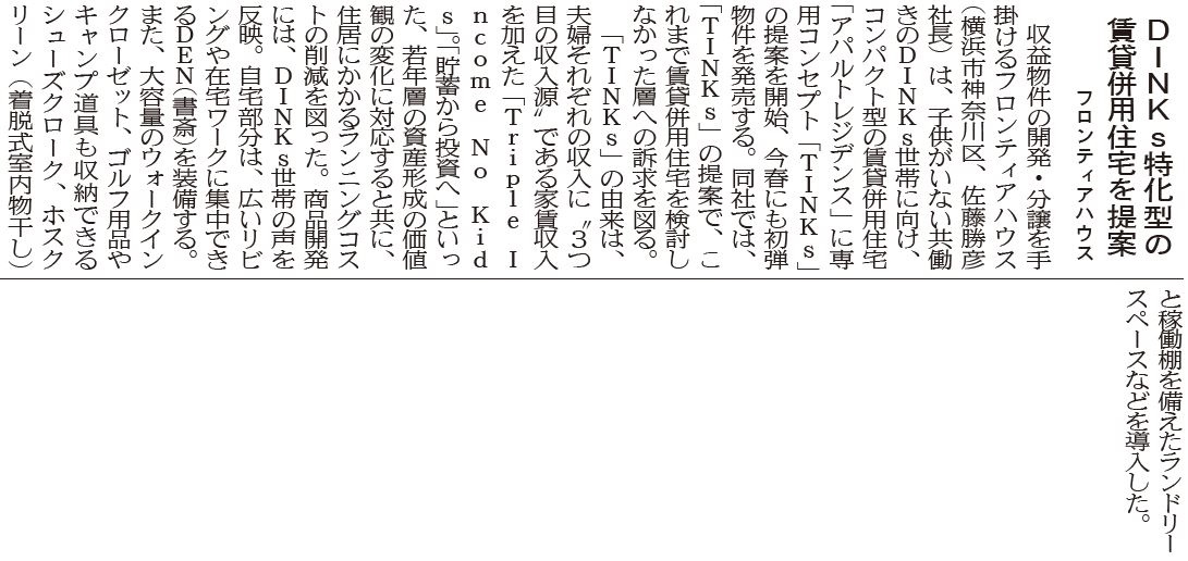 『住宅新報』に、アパルトレジデンス新コンセプト「TINKs」に関する記事が掲載されました