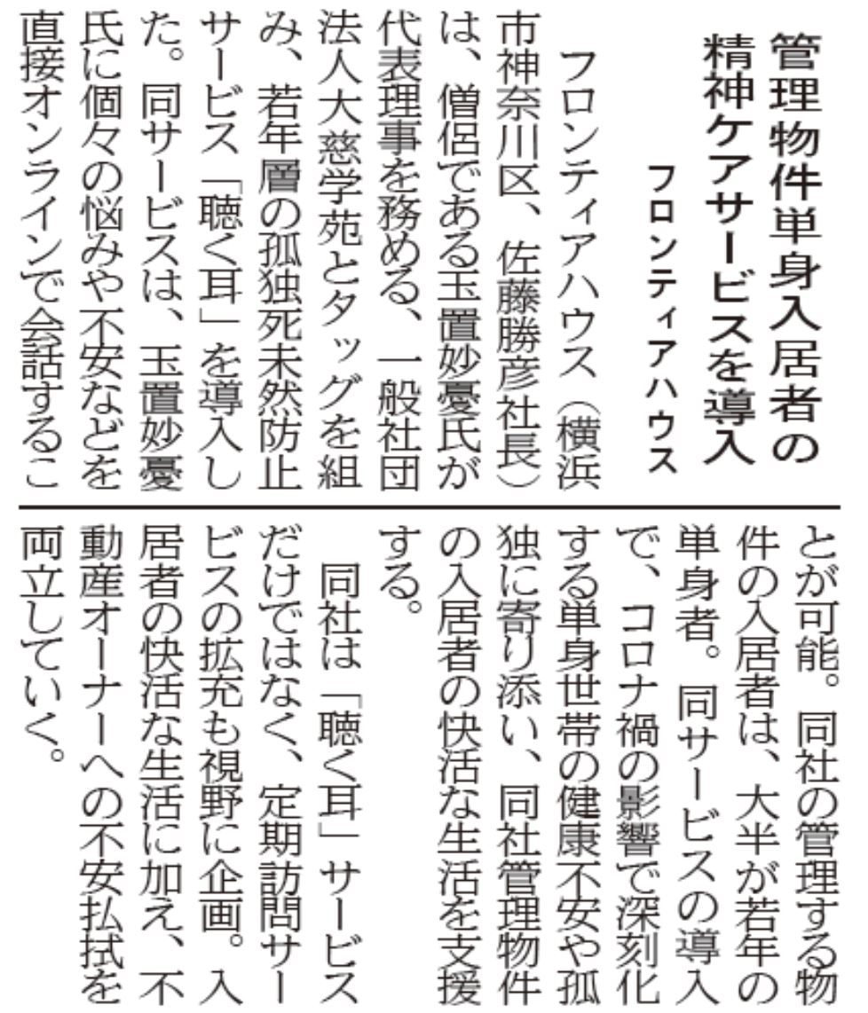• スピリチュアルケアサービス「聴く耳」に関する記事が住宅新報にて掲載されました