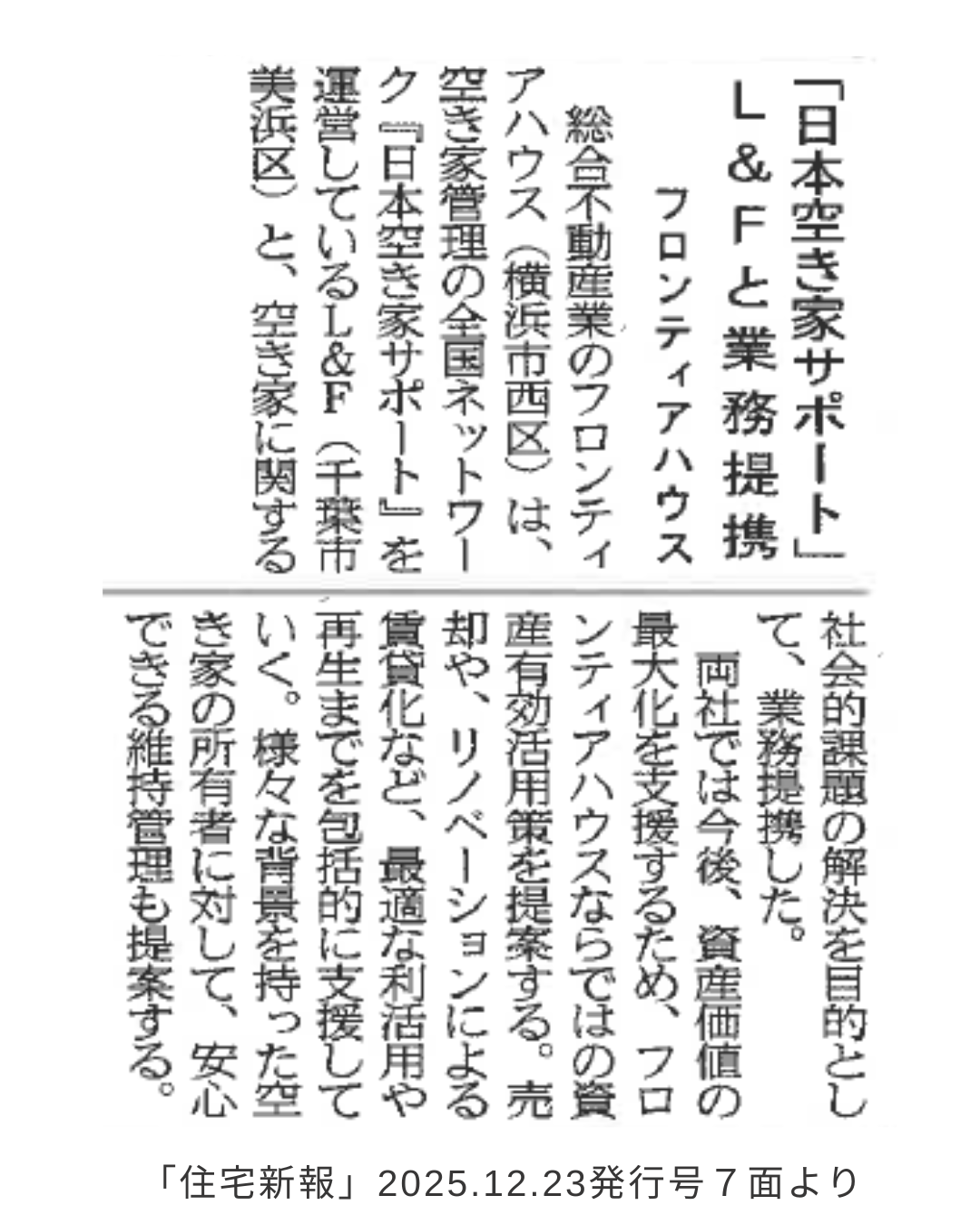 フロンティアハウスと「日本空き家サポート」を運営する株式会社L&Fの業務連携に関する記事が「住宅新報」に掲載されました。